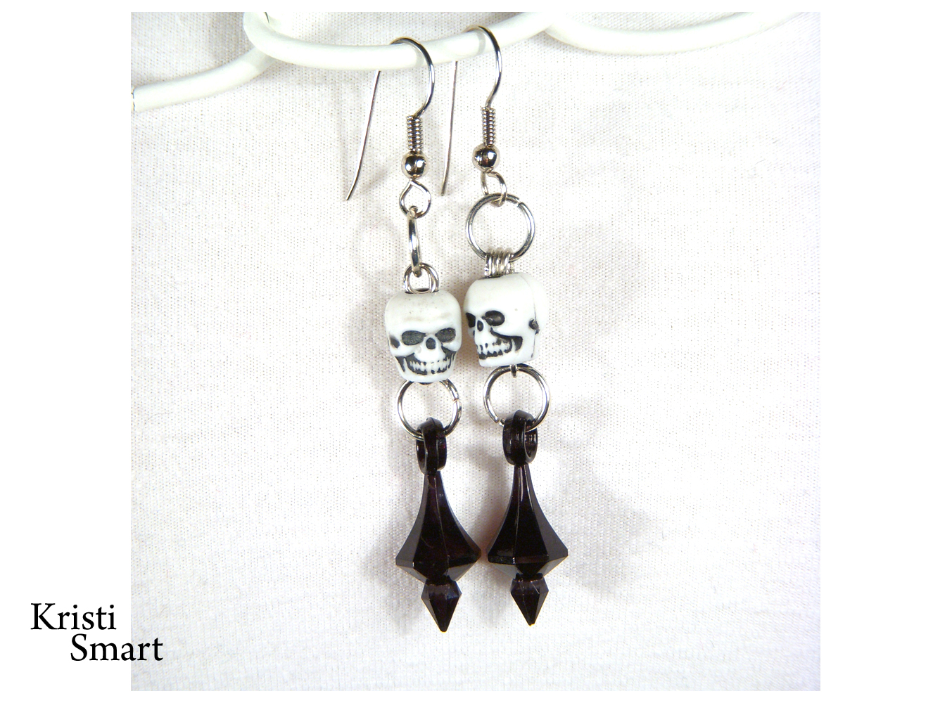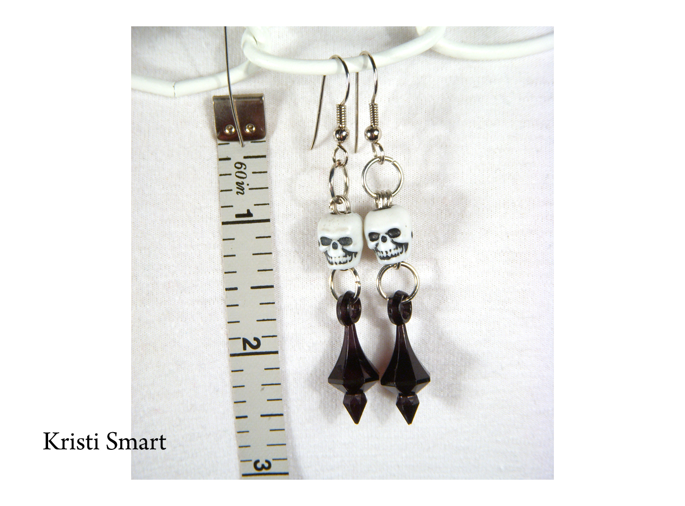 These skull earrings are so CUTE. The vintage black lucite dangles are a tiny bit translucent. If you hold them up to the light, you can see that they are either dark green or muddy purple depending on what kind of light is shining through them. I just love them.