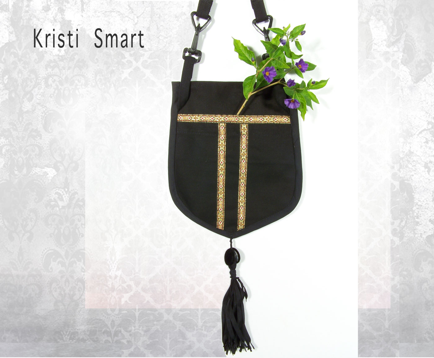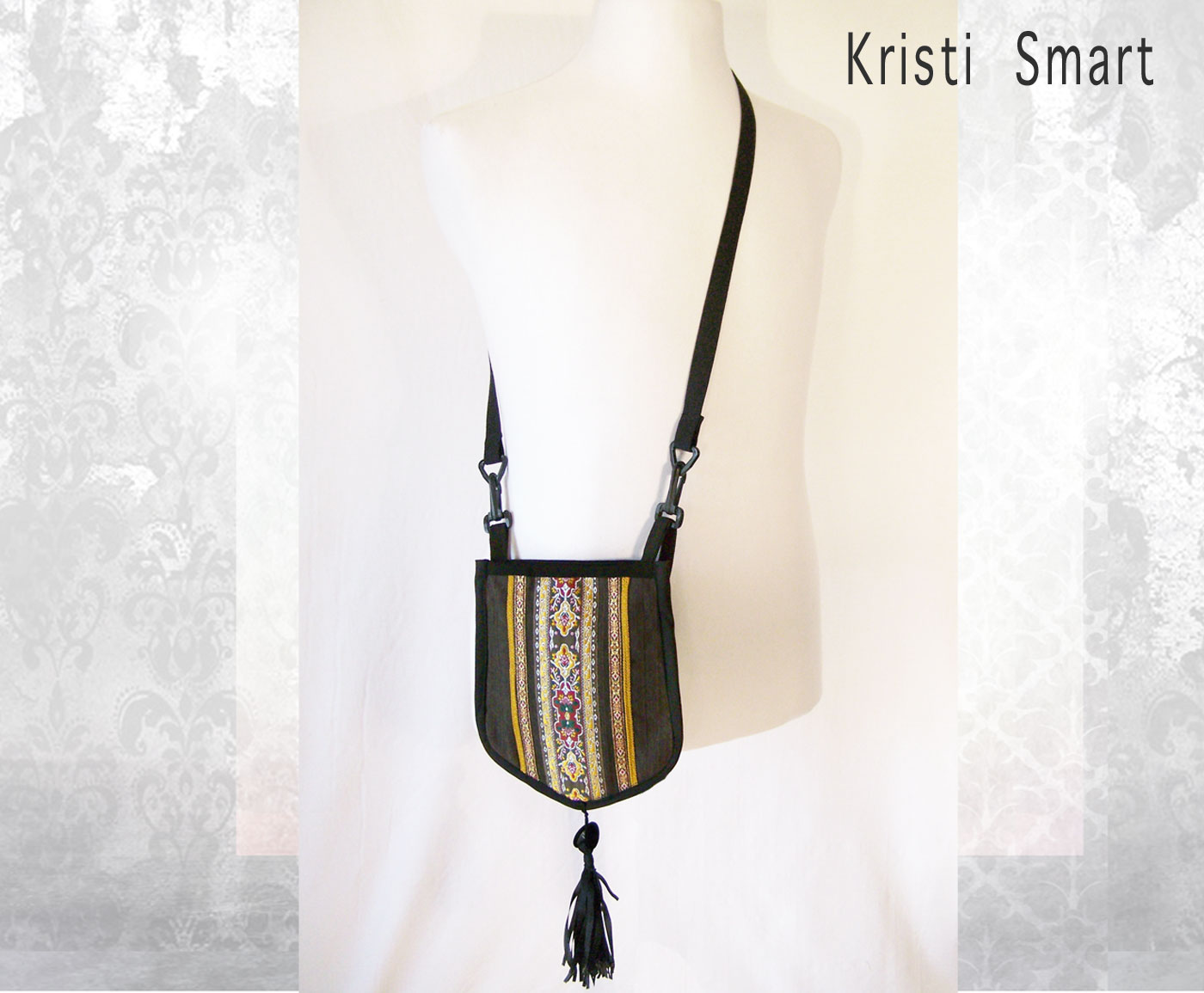 Double sided bag. A beautiful dusky front shows off some tonal colors. Accents of yellow and carnelian turn this purse pocket into a gem. Handmade over sized tassel is topped with velvet buttons. The back is secondary pocket edged in trim. Its held closed with a magnetic snap.