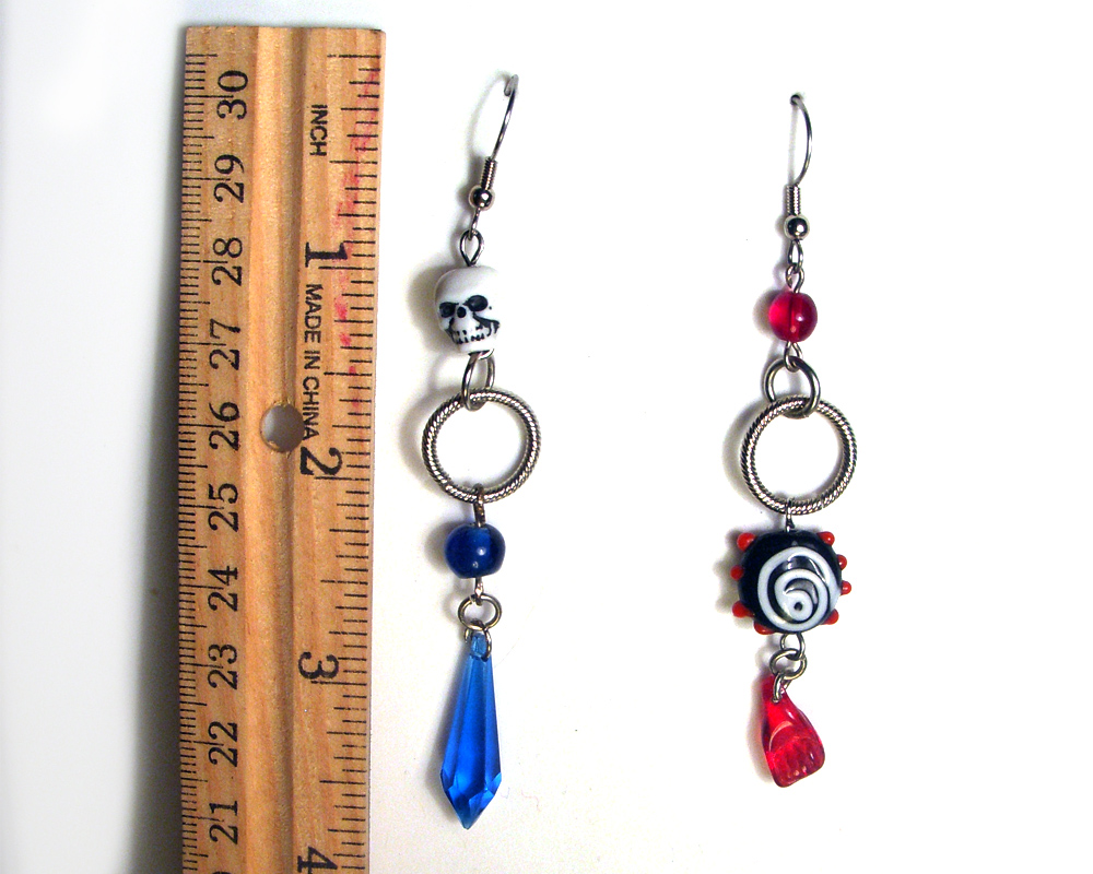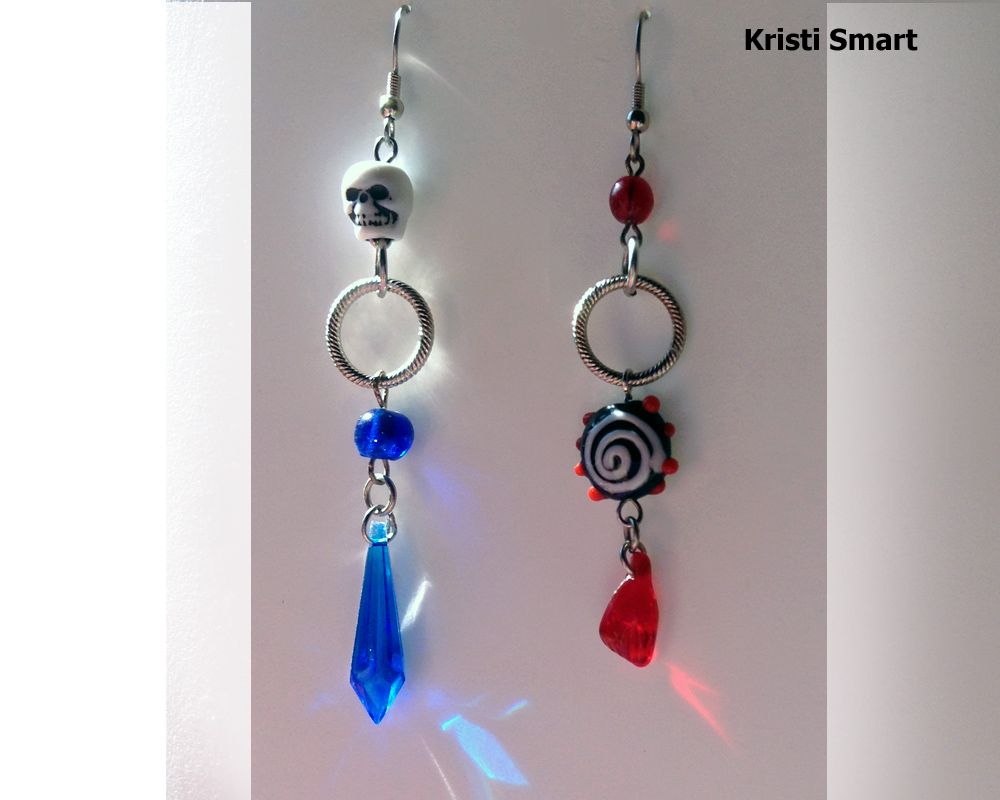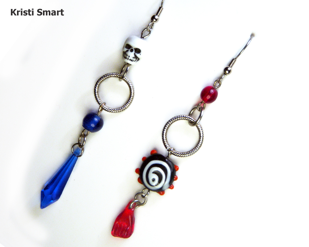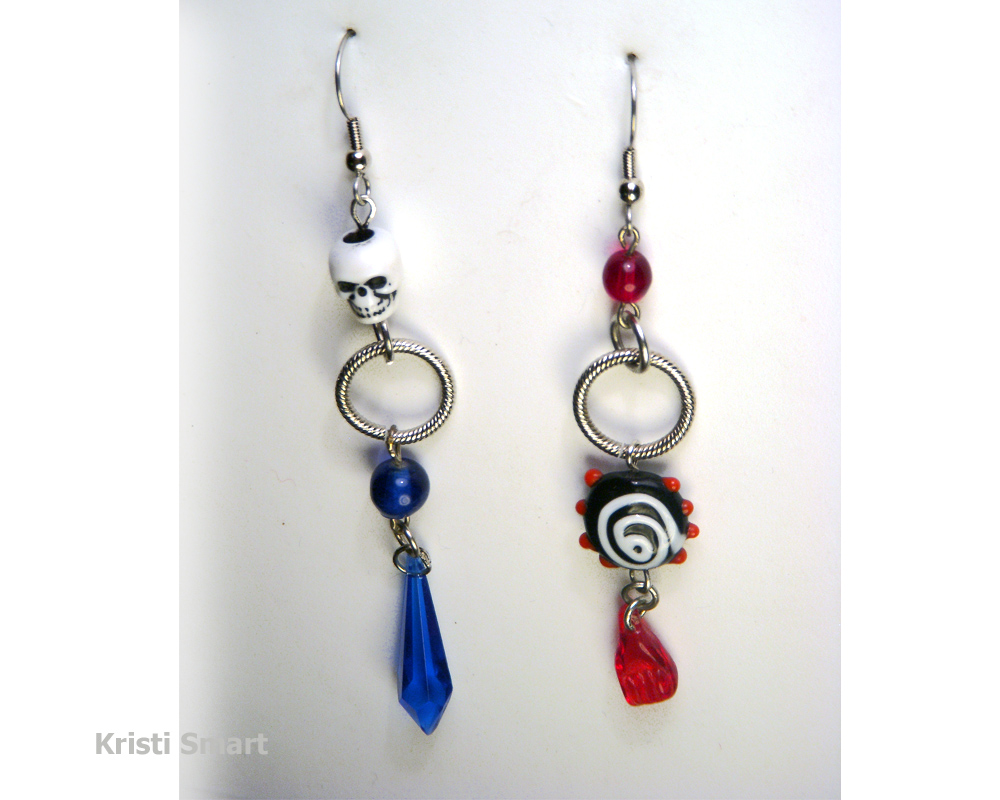 Mismatched earrings in red and blue. Features a small skull to keep you company. It will whisper sweet nothings in your ear. The crazy blown glass bead sits above a tiny clenched fist.
