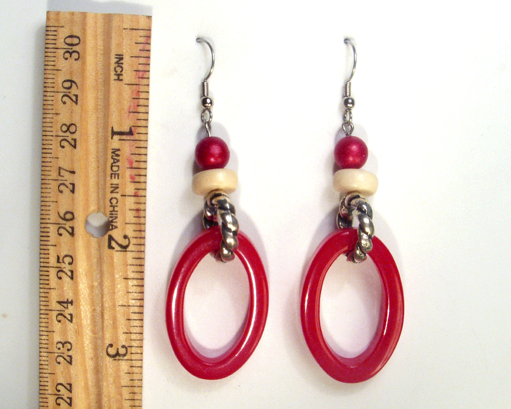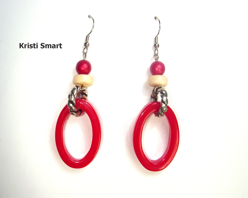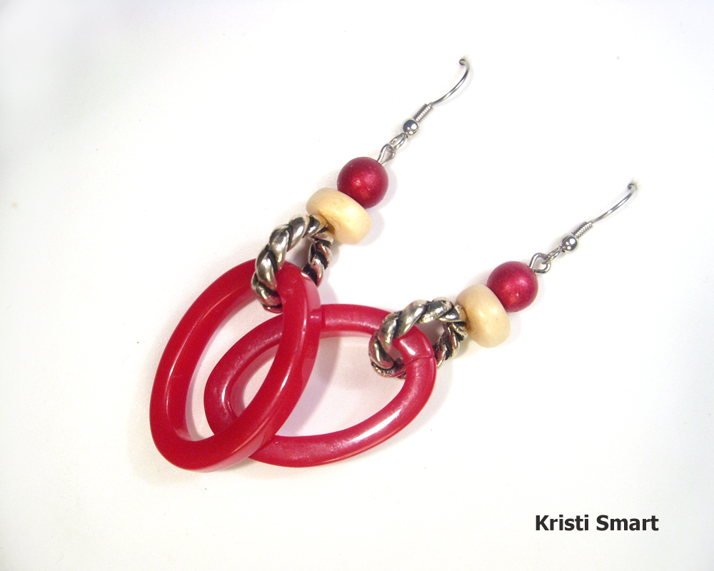 Cheery red hoops will brighten up your day. Lightweight and fun. Made with plastic hoops. Bone beads and vintage silver loops.