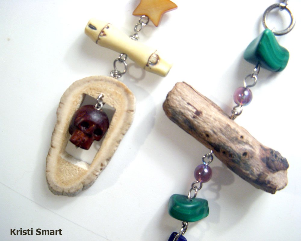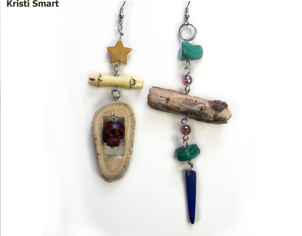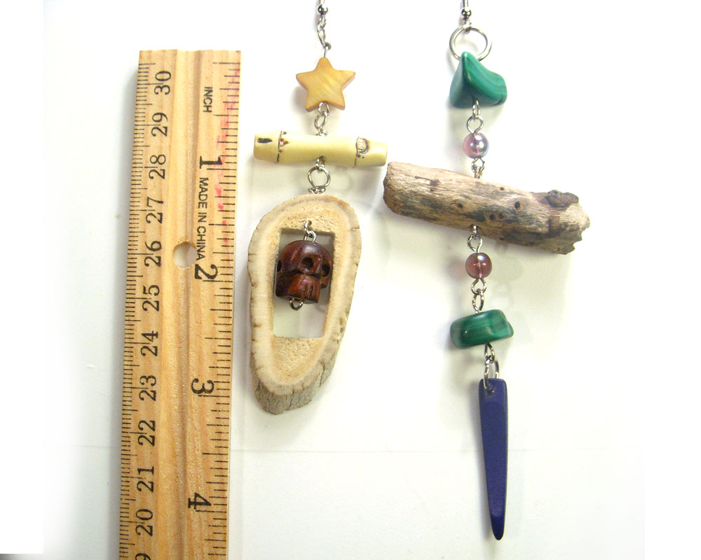 An unmatched and unique pair of earrings. They can be worn singly or as a pair. Made with bone, wood, rock and glass. The vintage antler frames a small carved wooden skull.